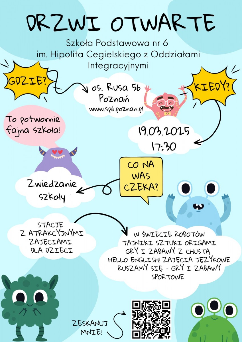 Zapraszamy na Drzwi Otwarte w naszej szkole. Spotykamy się 19 marca o godz. 17.30 w holu szkoły. Dzieciom zapewnimy ciekawe zabawy, rodzicom garść informacji o szkole. Do zobaczenia.
