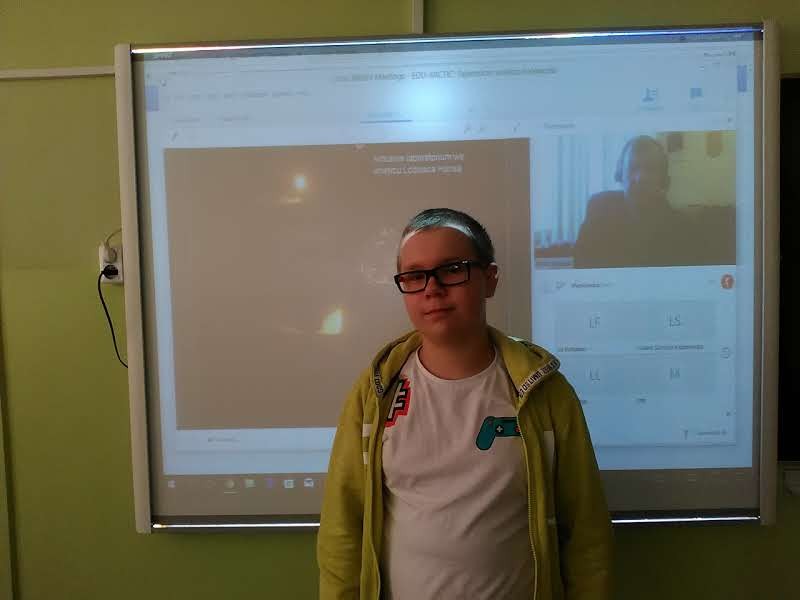 Z kolej na lekcji transmitowanej z polskiej stacji Polaris na Spitsbergenie Pani Anna Nadolna – geograf, hydrolog, miłośnik wspinaczki skałkowej – opowiedziała nam, co to jest zorza polarna i jak powstaje to zjawisko? Jaki może mieć kolor? Gdzie możemy to zobaczyć? Czy wpływa to na nasze życie i nasze zdrowie? Czy to tylko na Ziemi? Co to jest indeks Kp i jakie ma z nim pole magnetyczne Ziemi i wiatr słoneczny?